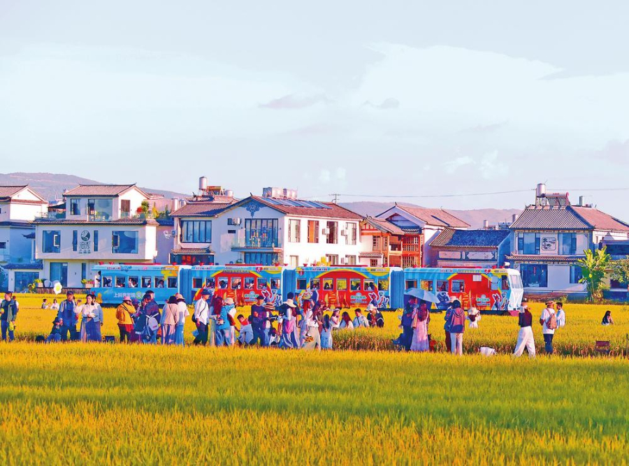 金秋十月,大理喜洲稻浪翻涌,“喜洲号”“有风号”小火车满载游客在稻田间穿行,形成独特的风景线,吸引了众多游客。近年来,喜洲镇通过“稻田+铁路”场景再造,将田园景观转化为可沉浸式体验的移动剧场,带动周边稻田咖啡、稻田旅拍等业态蓬勃发展,这片苍山脚下的稻田成为大理文旅的热门IP。